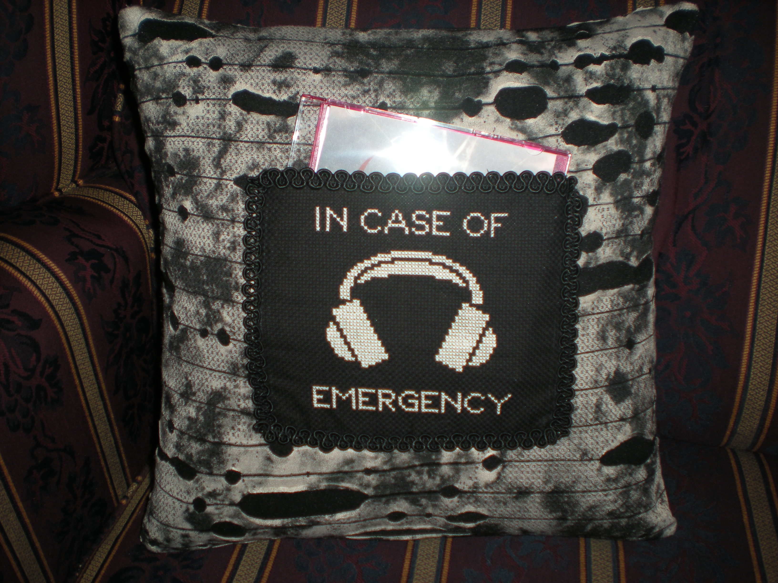 The obvious answer was a pillow. The person needed a pillow so they could lay back and enjoy their cd. With the end of the world in mind, I began designing a cross stitch that would become the cd pocket and searching for fallout appropriate fabric.