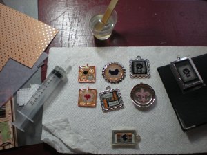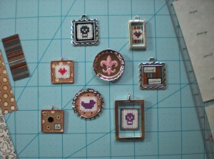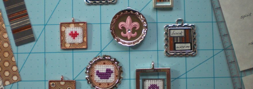 In the spring, I did a bit more research and started pouring resin jewelry. My favorite thing about making these is that each is a tiny work of art, a little bitty miniature illustration of… well, whatever’s on my mind. There’s a lovely design aspect involved and a pretty quick sense of accomplishment. Being particularly fond of fiber handicrafts, my first desire once I got my hands on some resin was to imbed tiny little cross stitch images in it, so I worked up several miniature cross stitches and a few baby collages to test out my first resin pour.
