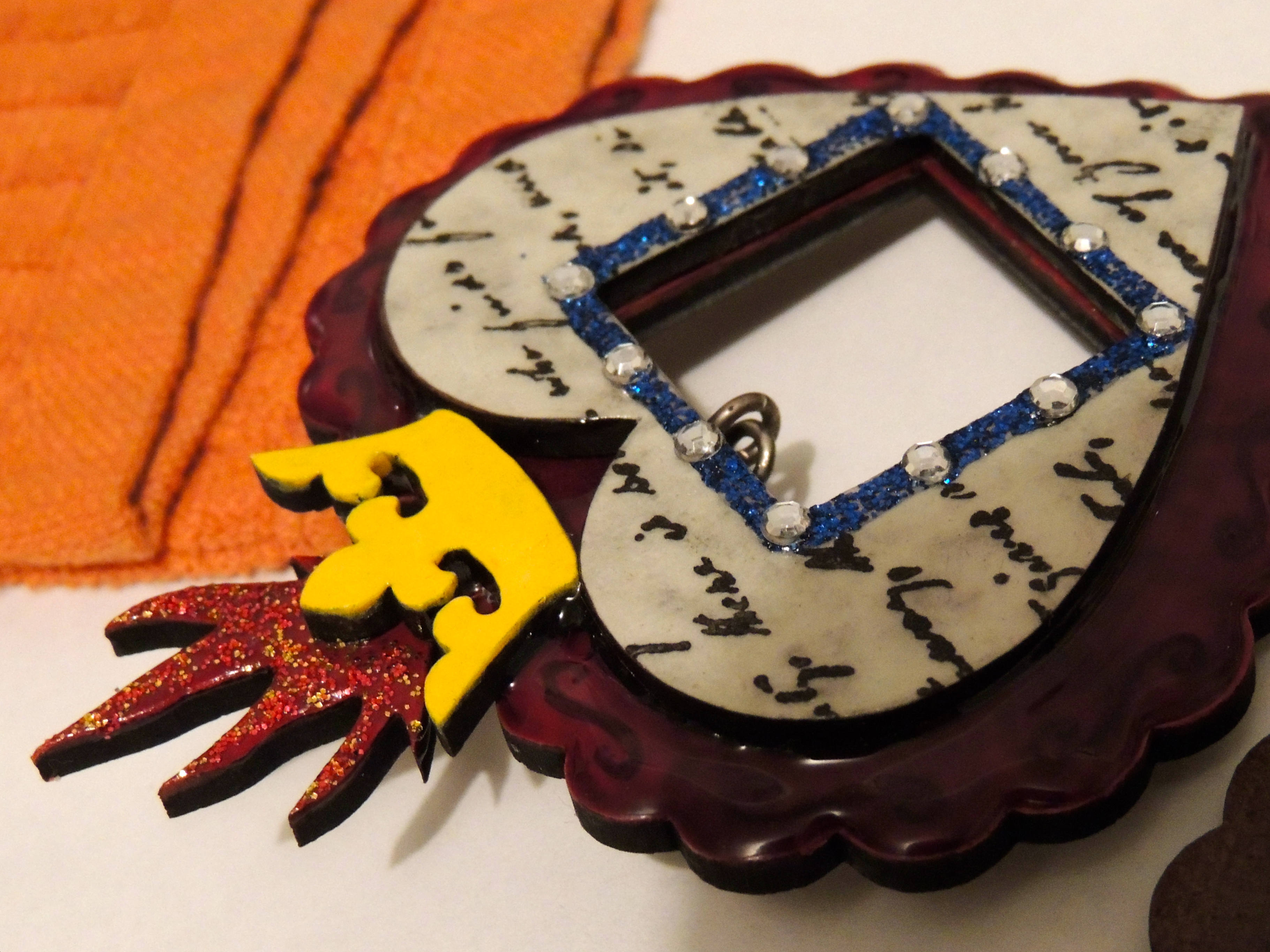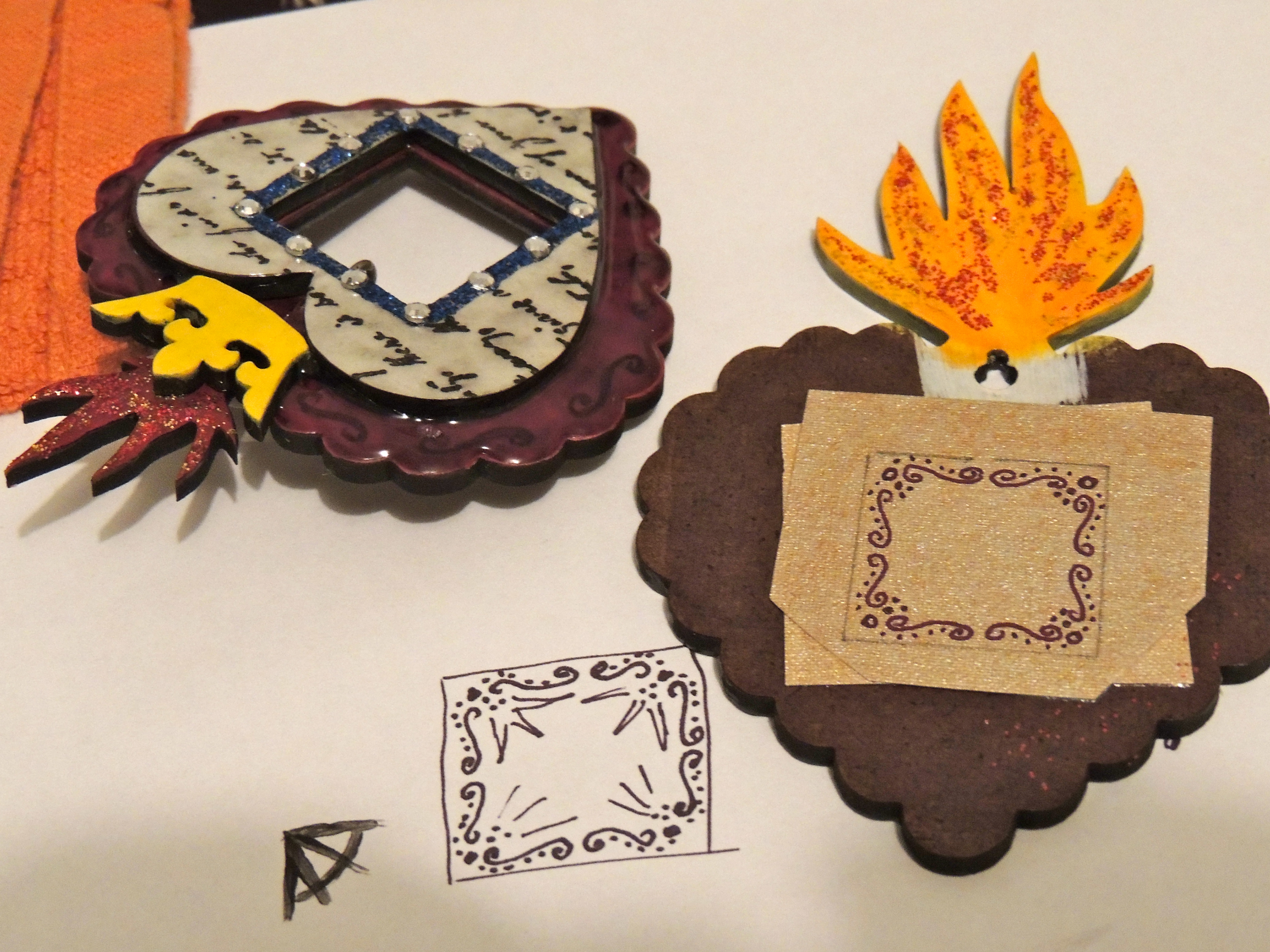 I had some gold fabric paper which I positioned to show in the window of the shrine, but it didn’t pop as much as I wanted so I drew a bit of scrollwork around the edges with a fine point Sharpie and then repeated a similar scroll around the edge of the red heart layer to tie it together.
