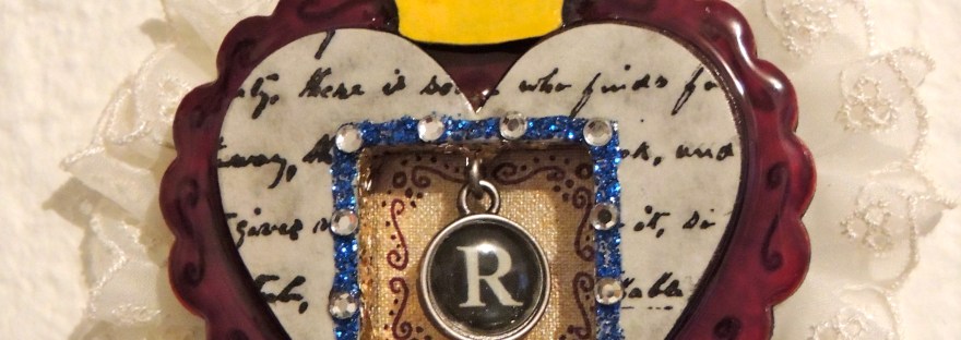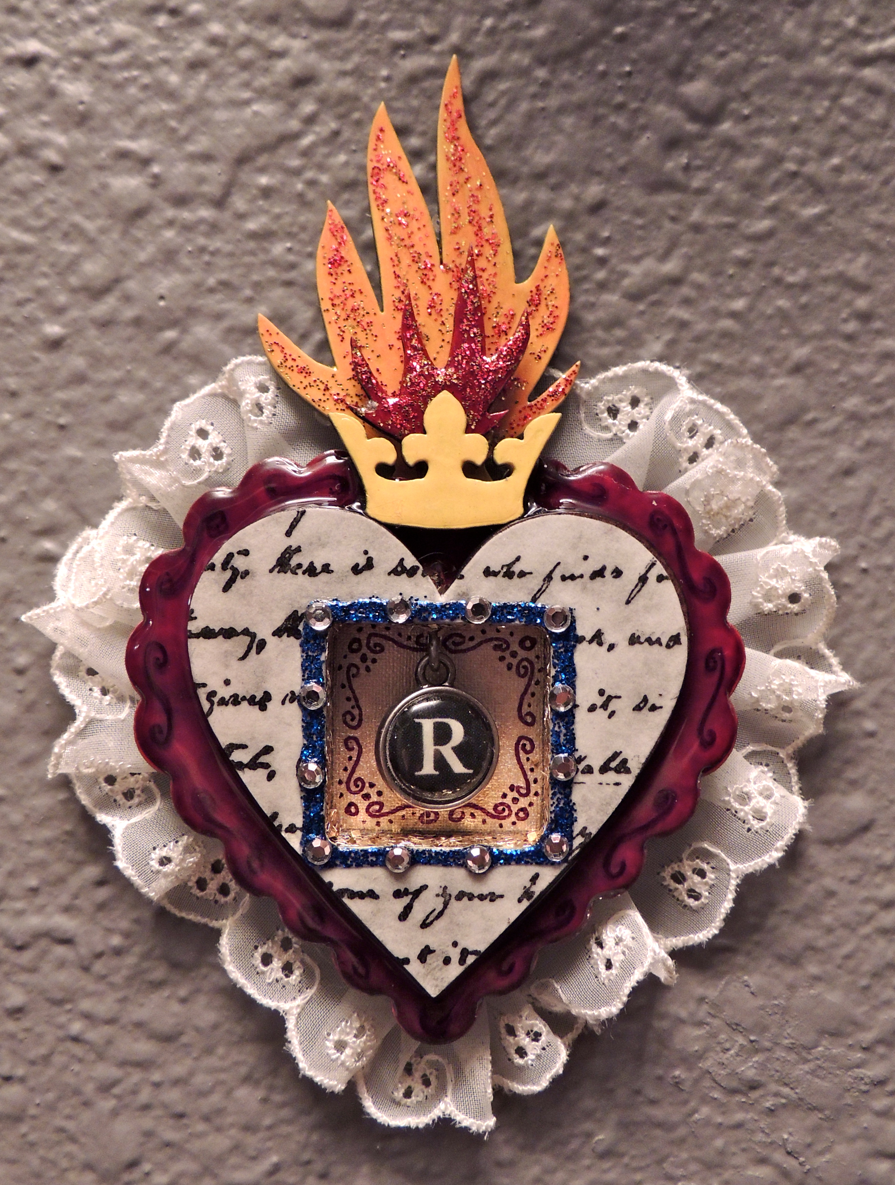 Since I was working this shrine up with my friend Rebecca, a writer, in mind, I also screwed a tiny eyehook into the top of the window to hang a charm styled after an antique typewriter key and finished the inside edges of the window with gold glitter to really set off the gold fabric paper, scrollwork and “R” charm. I then hot glued a bit of lace to the back to give the entire shrine an extra dimension.